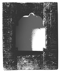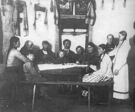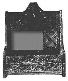 Апошні з гэтага рэгіёну здымак, на якім засяродзім увагу, зроблены Генрыхам Паддэмбскім у 1935–1938 гг. (пазітыў захоўваецца ў зборы К. Кукелы), на жаль, невядома, у якім паселішчы Палесся6. За сталом сядзіць сям’я, а на покуці добра праглядаюцца чатыры абразы пад агульным ручніком. Хоць амаль немагчыма разабраць сюжэты іконаў, аднак пэўныя назіранні ўсё ж можна выказаць. Абраз у самым куце ўпрыгожаны папяровымі кветкамі па перыметры. Такая аздоба была даволі пашыранай. Асабліва часта яна выкарыстоўвалася для ўбрання танных падакладніц або друкаваных абразкоў. Вядома таксама і тое, што рабілася яна неабавязкова гаспадарамі хаты, а магла быць саматужнай ці рамеснай вытворчасці, якая суіснавала ў звязцы і супрацоўніцтве з іканапіснымі майстэрнямі. Два абразы злева ад цэнтральнага таксама ўладкаваны ў ківоты за шклом, што бачна па бліках. На тым, што бліжэй да кута, можна нават разабраць тры постаці ў поўны рост пад шатай. Абраз нагадвае менавіта рускія іконы канца ХІХ ст. з выявай выбраных святых. А вось самы крайні злева абраз прываблівае ўвагу сваім сюжэтам. Тут можна разгледзець сілуэт светлага, запрэжанага ў гужавы транспарт, пра што сведчаць аглоблі, коніка; магчыма, што побач з ім ёсць яшчэ адзін. Выява каня адлюстраваная на абразах некалькіх сюжэтаў: з Юрыем Змеяборцам, у некаторых іканаграфічных зводах з Арханёлам Міхаілам, аднак яны паказаны вершнікамі ў сядле. А вось менавіта ў транспартным сродку адлюстроўваецца прарок Ілля, які ў вогненнай калясніцы ўзышоў на неба. Яго нашыя продкі шанавалі як святога, які кіруе навальніцай, маланкай, громам. Нельга сказаць, што яго абразы былі вельмі распаўсюджанымі, аднак яны маглі сустракацца ў хатах беларусаў. Абраз, які можна разгледзець на гэтым здымку, цікавасць выклікае яшчэ і тэхнікай выканання: гэта або літаграфія або абраз, напісаны на палатне, у любым выпадку дакладна бачна, што не на дошцы.