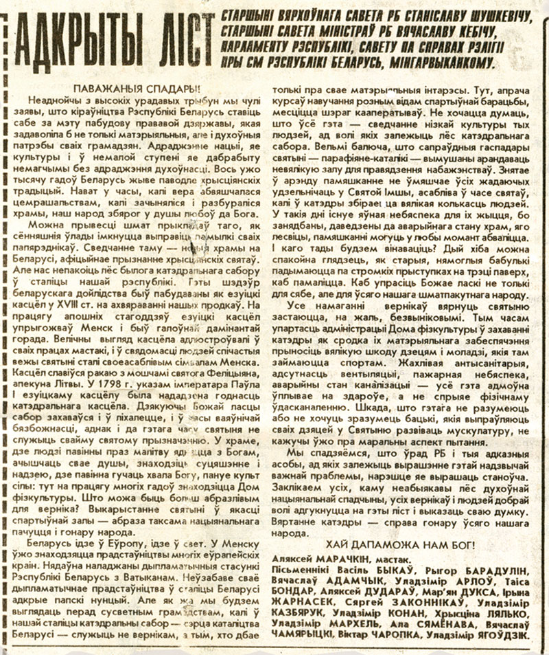 Гэта, бадай, адна з самых кароткіх гісторый, запісаных не толькі ў маім нататніку, але і — да самых драбніцаў — у маёй памяці. Быў 1993 год. Адзін з незабыўных 90-х, калі вакол адбывалася гэтулькі лёсавызначальных падзеяў; калі нашы надзеі і мары мелі яшчэ нікім і нічым не надламаныя крылы і так хацелася верыць, што канвульсіі бязбожнай сістэмы, якая рушылася на нашых вачах, часовыя і апошнія, а рэлігійнае і нацыянальнае адраджэнне, як тая вясновая паводка, пераадолее на сваім шляху ўсе магчымыя і немагчымыя заторы і перашкоды. На жаль, здараліся выпадкі, калі для такога пераадолення трэба было мабілізаваць немалыя сілы. Менавіта гэтак было з вяртаннем мінскай катэдры, якая ўсё яшчэ належала не католікам, а таварыству «Спартак». У той час да змагання за святыню актыўна далучалася творчая інтэлігенцыя сталіцы: у друку з’яўляліся артыкулы журналістаў і гісторыкаў, на беларускім тэлебачанні адбыўся «круглы стол» з удзелам мастакоў і пісьменнікаў, прысвечаны гісторыі старажытнага мінскага касцёла… Менавіта тады, у 1993 г., з’явілася ідэя напісаць адкрыты ліст — зварот творчай інтэлігенцыі да кіраўніцтва рэспублікі з настойліваю і абгрунтаванаю просьбаю вярнуць нарэшце катэдру вернікам. Ліст быў напісаны, але трэба было параіцца з кімсьці ўплывовым, як даць яму ход… Вырашылі звярнуцца да народнага паэта Беларусі Ніла Гілевіча, які ў той час быў дэпутатам Вярхоўнага Савета і старшынёю Пастаяннай камісіі па адукацыі, культуры і захаванні гістарычнай спадчыны. Ніл Сымонавіч параіў сабраць як мага больш подпісаў, і найперш самых аўтарытэтных мастакоў і пісьменнікаў, пажадана — народных, і аддаць ліст для друку ў газету «Звязда», паабяцаўшы папярэдне перамовіцца з яе галоўным рэдактарам Уладзімірам Наркевічам. Подпісы трэба было збіраць хутка. Ды лёгка сказаць — цяжка зрабіць… Цяпер ужо не хочацца згадваць тых, да каго я звярталася найперш, разлічваючы на добрыя асабістыя стасункі, і хто, на жаль, тады адмовіўся нас падтрымаць. Разумею, што ў кожнага з іх на тое былі свае прычыны: у кагосьці пэўныя асцярогі ды перасцярогі, а ў кагосьці, можа, і страх, бо ўсё яшчэ спрацоўвалі савецкія стэрэатыпы ў адносінах да рэлігіі ўвогуле, а да каталіцтва — асабліва.