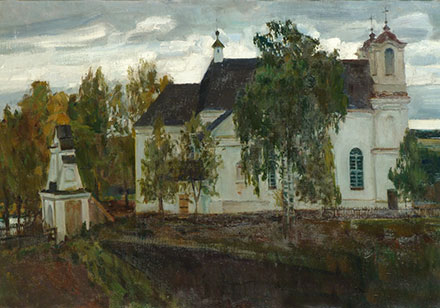 Мястэчка Вішнева з гэтым касцёлам знаходзіцца за 9 кіламетраў ад Багданава. Сувязь карціны Майсея Сляпяна з Фердынандам Рушчыцам — толькі здагадка, але здаецца, што яна найбольш пераканаўчая, хаця не менш праўдападобным мог быць і яго прыезд да сваякоў у напалову яўрэйскае Вішнева ці выкананне прыватнай замовы на напісанне карціны з касцёлам. Магчыма, Майсей Сляпян натхніўся карцінай Фердынанда Рушчыца «Каля касцёла. Нядзеля» (1899) з выяваю багданаўскага касцёла, ці яго аркушамі з накідамі вішнеўскага касцёла пачатку ХХ стагоддзя4. Не выключана, зрэшты, што ён напісаў толькі эцюд з натуры, а карціну выканаў па эцюдзе ўжо ў 1923 годзе ў Мінску. Касцёл у Вішневе Рушчыц пісаў некалькі разоў — акварэллю, з вышыні птушынага палёту, з вадаёмам у 1902 годзе, яшчэ да прыбудовы да галоўнага фасада двухвежавага нартэкса і наўпрост у максімальным набліжэнні, перадаючы асалоду ад яго старадаўняй пластыкі, лепкі сценаў, якія нагадваюць ластаўчына гняздо. Гэтая акварэль праз год была літаграфіраваная. У Майсея Сляпяна старадаўні касцёл зусім іншы. Храм, адлюстраваны на беразе вадаёма на заднім плане з уязной брамай, нібы замёр у спакоі, аднак непазбежнасць навальніцы адчуваецца ў бурных аблоках, у агульнай перадвосеньскай змрочнасці каларыту, агульным настроі смутку — песімізме, эстэтызацыі трывогі, прыхаваным сімвалізме пры рэалізме выканання, эстэтыцы «свету мастацтва», хоць Майсей Сляпян і ўваходзіў у Таварыства імя А. Куінджы, заснаванае ў 1909 годзе. Ён уступіў у яго з-за сваёй захопленасці пейзажамі, якіх стварыў нямала. Відавочна, падзяляў ён і дэкларацыю таварыства: «Аснова нашага мастацтва — прыгажосць і праўда; іх мы выказваем простай і яснай мовай, зразумелай шырокім масам». Гэтага крэда Майсей Сляпян прытрымліваўся ў сваёй творчасці да канца жыцця. Крыніцай яго натхнення стала родная зямля, паэтычныя пачуцці, выкліканыя сціплай, але такой чароўнай прыгажосцю беларускай прыроды, зусім не эфектныя вуліцы роднага Мінску. Усе краявіды пісаліся ім на натуры, на пленэрах, у Мінску і ваколіцах. Толькі па каталогах мінскіх выставаў, на жаль, вядомы яго пейзажы «Першы снег», «Восеньскія матывы», краявіды закінутай ускраіны Мінска — каля Татарскіх агародаў — Людамонта з яго броварамі і парахавымі складамі, эцюды са станцыі Калодзішчы. У Вішневе Майсей Сляпян з многіх ракурсаў абраў бакавы фасад касцёла, адышоўшы ад прыгажэйшага выгляду галоўнага фасада з адлюстраваннем у вадаёме, на беразе якога стаіць касцёл. У вішнеўскім пейзажы з касцёлам яго ўразілі цішыня і спакой, кантраст цвярдыні маналіту старога будынка і дрэваў з неспакойным хмарным небам. «Па ўнутрыжанравай класіфікацыі — гэты твор належыць да „пейзажа настрою“. Але гэта толькі словы... Гэта заўсёды цуд — як мастак здолеў на невялікім палатне звычайнымі інструментамі сказаць так шмат і пра гэтую зямлю, і пра чалавечы лёс», піша Валянціна Вайцэхоўская. «Больш трывога, чым цішыня, гэта — нібы прадчуванне бураў XX стагоддзя, яшчэ больш жорсткіх, чым раней, выпрабаванняў. Храм выстаяў, касцёл Наведвання Марыі Лізаветай і цяпер знаходзіцца ў вёсцы Вішнева Валожынскага раёна Мінскай вобласці»5. Ён не закрываўся нават у гады савецкай улады і Вялікай Айчыннай вайны... Але як гэтая карціна трапіла да Собінавых? Тут можна выказваць толькі здагадкі. На жаль, Алена Аладава не пакінула 