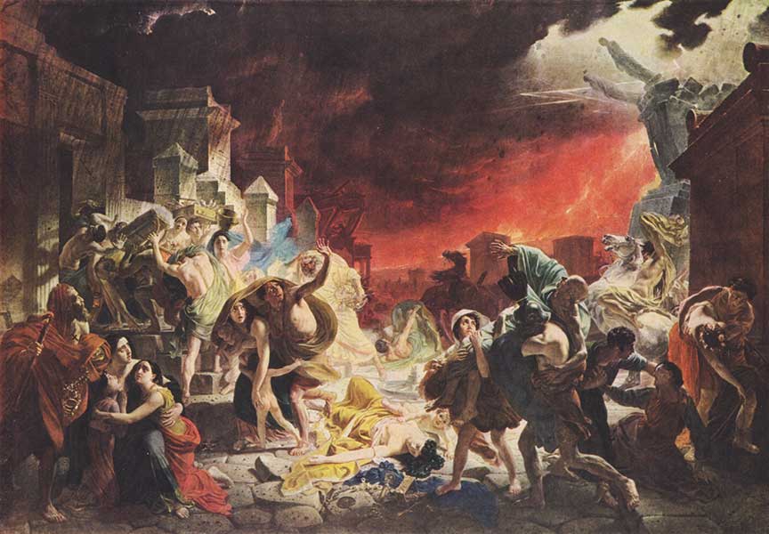 Карціна Карла Брулова пра лакальную катастрофу ў гісторыі старажытнага свету — адзін з агульнавядомых і вельмі папулярных твораў рускага жывапісу. Калі б са спадчыны мастака не засталося больш нічога, ягонае імя ўсё роўна вечна жыло б у гісторыі мастацтва. Каласальнае палатно хвалюе ўжо многія пакаленні людзей, якім, здавалася б, не трэба каментаваць сюжэт і рабіць падрабязны фармальна-вобразны аналіз твора. Яго мова настолькі ясная, а драма настолькі агульначалавечая, што прачытанне жывапісу для многіх не ўяўляе складанасці. Але тым не менш людзі кожнага гістарычнага часу адкрываюць у карціне вялікага мастака нешта новае. Гэта азначае, што твор працягвае жыць, быць актуальным і патрэбным людзям. Карл Брулоў (1799–1852) нарадзіўся ў Санкт-Пецярбургу ў сям’і акадэміка Імператарскай Акадэміі мастацтваў Паўла Бруло, скульптара і гравёра французскага паходжання. З ранняга ўзросту ён фармаваўся ў атмасферы Акадэміі, ужо ў 1809 г. пачаў рэгулярныя заняткі малюнкам і жывапісам, да 1821 г. навучаўся пад кіраўніцтвам выдатнага майстра класіцызму Андрэя Іванава. Адзін з лепшых студэнтаў свайго пакалення, Карл Брулоў атрымаў залаты медаль і быў накіраваны ў Італію, дзе распачаўся плённы перыяд яго творчасці. Мастак працаваў над малюнкамі і палотнамі, падарожнічаў па Еўропе. У 1836 г., пасля падарожжа па Грэцыі і Турцыі, мастак вяртаецца ў Расею. Мяркуецца, што вяртанне Брулова было звязана з шумным поспехам яго карціны «Апошні дзень Пампеі» ў Італіі і Францыі. Палатно было выстаўлена ў Луўры, і да яго імкнуліся натоўпы. У Пецярбургу карціну і аўтара чакаў трыумф. Паэты прысвячалі палатну вершы, у хуткім часе яно было падоранае Мікалаю І (які пазней падарыў яго Акадэміі мастацтваў). Мастака прымалі і завязвалі з ім сяброўства выдатнейшыя людзі тае пары: А. Пушкін, В. Жукоўскі, І. Крылоў. Да 1849 г. Карл Брулоў прафесарствуе ў пецярбургскай Акадэміі мастацтваў, малюе шмат партрэтаў, удзельнічае ў размалёўцы Ісаакіеўскага сабора. Але ў халодным горадзе ў яго абвастраецца хвароба (залатуха). Ён назаўжды пакідае Расію — выязджае лекавацца на востраў Мадэйру, потым пераязджае ў любімую Італію, дзе памірае ў мястэчку Манцыяна пад Рымам. Малады мастак зацікавіўся гісторыяй гібелі Пампеі ў 1828 годзе. Ён паехаў туды з Рыма разам з многімі іншымі цікаўнымі людзьмі, якія даведаліся, што зноў задыміў Везувій. Але тэма Пампеяў жыла ў свядомасці еўрапейцаў ужо амаль 70 гадоў, з часу выпадковага адкрыцця антычнага горада (менавіта горада, а не яго руінаў), пахаванага пад тоўстым слоем лавы і попелу. Пампейскія фрэскі, сам вобраз горада — равесніка Рымскай імперыі — сталі прычынай новага прыліву захаплення антычнасцю ў еўрапейскай культуры. Гэтым захапленнем жывіліся класіцызм і ампір. Пецярбургскі мастацтвазнаўца Аляксей Савінаў (некаторы час ён працаваў у Мастацкім музеі Беларусі ў Мінску) так напісаў пра шэдэўр Карла Брулова: «Захапляльнасць аповеду, разнастайнасць характарыстык, пластычная прыгажосць формаў, багатыя па сілуэтах групоўкі фігураў, іх кампазіцыйнае адзінства надаюць карціне выразнасць і мастацкую сілу. Традыцыі строгага, звернутага да антычнасці класіцызму Брулоў спалучаў з новымі тэндэнцыямі рамантычнага жывапісу, з пачуццём сапраўднасці падзеі, увасобіўшы ў ясным па пабудове палатне ідэю гібелі антычнага свету»1. Матывам для карціны п