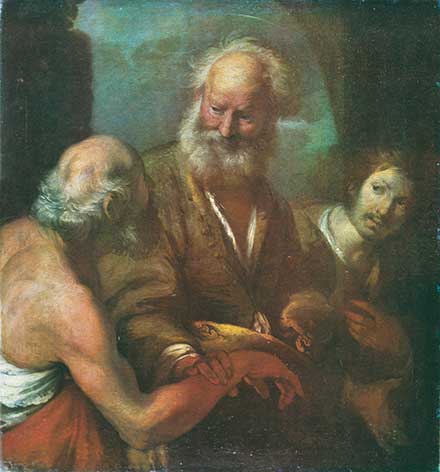 Бэрнарда Строццы (1581–1644) не належыць да гігантаў сваёй эпохі, але ягонымі творамі ганарацца многія музеі Еўропы і Амерыкі. Сучаснікі часцей называлі мастака не па імені, а выкарыстоўвалі два ягоных «творчых псеўданімы»: Il Cappuccino (Капуцын) i Il Prete Genovese (Генуэзскі святар). Бэрнарда Строццы нарадзіўся ў Генуі. У 17-гадовым узросце ён уступіў у Ордэн капуцынаў, а ў 1610 г. з дазволу генерала Ордэну пакінуў кляштар, каб утрымліваць сваю сям’ю. Ягоная святарская біяграфія па-свойму драматычная. У 1630 г. памерла яго маці і Ордэн запатрабаваў ягонага звароту ў кляштар. Калі Строццы адмовіўся, то быў ... арыштаваны, але здолеў уцячы ў Венецыю, дзе жыў і працаваў да смерці. Малады мастак вучыўся ў генуэзскага жывапісца Валерыа Кортэ і сіенца П’етра Сорры. Ён быў таксама майстрам інжынернага мастацтва. У гарадскіх архівах яго згадваюць як карабельнага інжынера Генуэзскай рэспублікі. Строццы, як і многія іншыя сучаснікі, захапіўся творчасцю Караваджа. Да таго ж у Генуі ён блізка пазнаёміўся з караваджыстамі — французам Сімонам Вуэ і італьянцам Арацыа Джэнцілескі. Генуя была таксама горадам, дзе па некалькі гадоў працавалі вялікія фламандскія жывапісцы эпохі Пітэр-Паўль Рубенс і Антоніс ван Дэйк, творы якіх паўплывалі на Строццы. У Венецыі мастак успрыняў уплывы выдатнага майстра Паола Веранэзэ. Але ўсе гэтыя ўплывы не перашкодзілі мастаку выпрацаваць у жывапісе сваю непаўторную манеру. Калі карціна Строццы, прысвечаная святому Пятру, трапіла ў 1940 годзе ў зборы Львоўскай карціннай галерэі, вялікіх праблемаў з недатаваным аўтарам палатном не было. Цэнтральная постаць сюжэта лёгка пазнавалася ў іншых карцінах мастака, выкананых менавіта ў позні перыяд яго творчасці, у 1630-я гады. Аднак у параўнанні з работамі, што знаходзяцца ў іншых музеях (Санкт-Пецярбург, Будапешт, Таронта), яркая натура праявілася найбольш выразна і дынамічна менавіта ў гэтым палатне. Святы Пётр Строццы — гэта не знаёмая нам з безлічы мастацкіх твораў сімвалічная фігура, якую лёгка ідэнтыфікаваць сярод іншых апосталаў паводле ключа або кнігі ў руцэ. Мастак стварыў кампазіцыю амаль у рамках бытавога жанру, распавёўшы пра цуд лекарскай практыкі. Тое, што гэта цуд, мы разумеем з усхваляванай рэакцыі персанажаў карціны, і не толькі. ...Апостал бярэ за руку пажылога паралітыка і аздараўляе яго малітвай і сілай, дадзенай яму Богам. Яго рука далікатна, але ўпэўнена сціскае бязвольную руку хворага – і чалавек вызваляецца ад свайго няшчасця. І хаця гэты кампазіцыйны вузел знаходзіцца ў ценю, ён з’яўляецца адным з вызначальных у карціне. Дакрананне адбываецца на першым плане і падкрэслена чырвонымі тонамі, якія прабіваюцца з паўзмроку. Але цуд створаны не толькі тым, што ў медыцыне называецца мануальным кантактам. Выратаваны паралітык падымае галаву і ў захапленні, з удзячнасцю ўглядаецца ў твар Апостала. Яны равеснікі — хворы і апостал Пётр. Абодва сівавалосыя барадачы з сакратаўскімі галовамі. У кожнага за плячыма пражытае жыццё.Мастак падкрэслівае ў выяве паралітыка плоцевы пачатак існавання. Мы бачым торс некалі моцнага, нават атлетычнага чалавека. Вызвалены ад немачы, ён, увесь прасякнуты рухам, імкнецца насустрач свайму выратавальніку. Гулкі кантраст белі і чырвані яго вопраткі і магутнай карнацыі торса яшчэ больш узмацняе дынаміку твора... Але цэнтрам усяго, вяршыняй пірамі