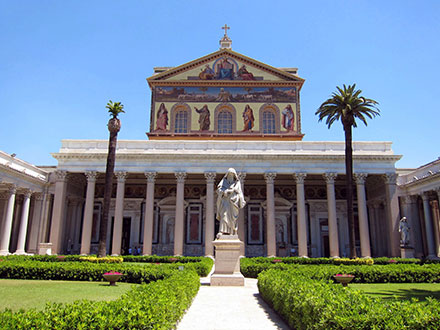 Сустрэча з Вечным горадам (як са старажытнасці называюць Рым) застаецца ў душы назаўжды. Для Еўропы і ўсяго свету Рым быў, ёсць і будзе жывой старонкай гісторыі, цэнтрам Каталіцкага Касцёла, адной з галоўных святыняў універсальнага хрысціянства. Дактрынальныя спробы, прадпрынятыя ў іншых частках свету, абвясціць сябе «новым Рымам» з ужываннем у тытулатуры нейкіх парадкавых лічбаў заўсёды выглядалі як авантура, як штучны рымэйк і праява імперскай пыхі. Aeterna urbs — непаўторны ў сваім зямным і духоўным існаванні феномен. Гісторыя паказала, што Вечны горад можа быць толькі арыенцірам, а не падручным матэрыялам для ідэалагічна-дзяржаўных новабудоўляў (кшталту хімеры «Свяшчэннай Рымскай імперыі германскай нацыі» і падобнага). ...Усё гэта перажываеш штораз, ідучы дарогамі, вуліцамі і плошчамі Рыма, у якім няма кутка, дзе б не тварылася гісторыя чалавецтва. Пакідаючы шумны цэнтр, набліжаешся да Аўрэліянавых муроў (Mura aureliane), якія выдатна захаваліся як для помніка фартыфікацыі ІІІ стагоддзя, што выконваў свае функцыі з часоў Вялікага перасялення народаў да апошняй сусветнай вайны. Праходзячы праз браму св. Паўла, мы пакідаем межы Рыма часоў імператара Аўрэліяна і накіроўваемся на поўдзень. Мэта нашага падарожжа таму і называецца базылікай святога Паўла за мурамі (San Paolo fuori le mura), што святыня была пабудавана па-за перыметрам Аўрэліянавых муроў. Зразумела, што горад даўно разросся ўшыркі, але памяць пра яго колішнюю перыферыйнасць захавалася, нягледзячы на тое, што святыня Паўла з’яўляецца адной з чатырох патрыяршых базылікаў Рыма. Імператар Канстанцін загадаў закласці гэты храм на дарозе, што вяла ў горад Осцію (Via Ostiense). Сабор быў закладзены на месцы магчымага пахавання Апостала, які разам з святым Пятром стаў ахвярай Неронавых ганенняў на хрысціянаў пасля вялікага пажару Рыма ў 64 годзе. Ужо з І стагоддзя гэтае месца было мэтай пілігрымак і пакланення. 18 лістапада 324 года папа Сільвестр І асвяціў пабудаваны храм. У 2006 годзе італьянскія археолагі знайшлі ў сутарэннях сабора саркафаг з надпісамі і чалавечымі парэшткамі, якія сведчылі аб тым, што тут сапраўды пахаваны апостал Павел. Невялікая канстанцінаўская базыліка ў хуткім часе ўжо не змяшчала вялікіх масаў вернікаў, якія імкнуліся сюды, імператар Феадосій І загадаў пабудаваць вялікі храм, дастойны памяці Апостала. Працамі кіраваў professor mechanicus (як тады называліся дойліды) Цырыяд. Ён рэалізаваў праект, падобны на першы ватыканскі сабор святога Пятра: пяцінававая базыліка з 80-цю калонамі і порцікам. Дзякуючы гэтай пабудове мы можам уявіць, як выглядаў першы ватыканскі сабор святога Пятра. Базыліка была закончана ў 395 годзе і традыцыйна называецца «базылікай трох імператараў», пры якіх адбывалася будаўніцтва: Феадосія І, Грацыяна і Валентыніяна ІІ (хаця будаўнічыя працы былі завершаны ўжо пры імператары Ганорыі ў 395 годзе). Папа Сірыцый асвяціў яе ў 390 годзе. Базыліка прастаяла ў такім выглядзе амаль паўтара тысячагоддзя, але ў 1823 годзе моцна пацярпела ад пажару, ператварыўшыся ў руіну. Папа Леў ХІІ звярнуўся да біскупаў з энцыклікай «Ad plurimas» ад 25 студзеня 1825 года, у якой заклікаў збіраць сродкі на рэканструкцыю храма. Увесь хрысціянскі свет адгукнуўся на гэты заклік. Да тысяч простых вернікаў далучыліся каранаваныя асобы: каралі Сардзініі, Францыі, Нідэрландаў. Рускі цар Мікалай І ахвяр