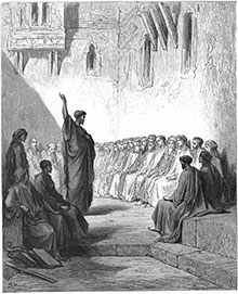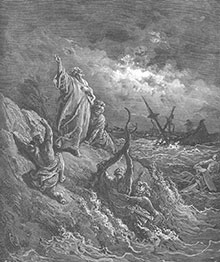 Трэцяя ілюстрацыя пра дзеі апостала Паўла дэманструе ўсё багацце графічнага стылю Густава Дарэ. Мастак распавядае пра плаванне карабля з Апосталам і іншымі вязнямі курсам на Італію. На працягу цяжкага падарожжа Павел падбадзёрваў спадарожнікаў. Апосталу з’яўляўся анёл Бога, які адкрыў яму будучыню. Павел прадказаў людзям, што карабель загіне, але ўсе яны выратуюцца. Так і здарылася, калі карабель сеў на мель і быў разбіты хвалямі. Воіны хацелі пазабіваць вязняў, але сотнік утрымаў іх, каб ратаваць Паўла. Чорны ламаны сілуэт карабля, які гіне ў хвалях, рэзка вырысоўваецца на фоне неба, дзе імклівыя хмары раптам разрываюцца і адкрываюць шлях чыстаму святлу. Да яго, да гэтага Божага знака, звяртаецца апостал Павел, узнімаючы правую руку і прыціскаючы левую да сэрца. Паўтараецца той жа патэтычны жэст (з папярэдняй ілюстрацыі), але ён напоўнены ўжо іншым сэнсам — Бог пачуў малітву і ратуе людзей. Фігура Апостала — як манумент хрысціянскага трыумфу сярод, здавалася б, усемагутнай знішчальнай стыхіі. Пакутліва выгінаецца ствол скалечанага дрэва на скале, паўтараючы бязладны сілуэт мачтаў карабля. Людзі ў адчаі хапаюцца за гэты ствол, за выступы скалы, караскаюцца на бераг, імкнуцца бліжэй да Апостала і ратуюцца яго малітвамі. Штрыхі то згушчаюцца ў пагрозлівую чарнату буры, то губляюць цяжар і рассыпаюцца ў нюансах шэрых тонаў. Мастак па-майстэрску перадае грубую матэрыю скалы і зменлівыя гармоніі марскіх хваляў. У гэтай гравюры ёсць патэтыка і дынамізм, уласцівы барока. Гэта адзін з класічных па вырашэнні твораў мастака. Апошняя кампазіцыя, прысвечаная апосталу Паўлу, ілюструе яго Першае Пасланне да Тэсаланікійцаў, а дакладней — словы Апостала аб тым, што Бог любіць кожнага чалавека, як бацька любіць сваіх дзяцей. Маўклівая аўдыторыя ўважліва ўслухоўваецца ў палымяную прамову Апостала. Павел стаіць пасярод вузкага дворыка, які замыкаюць высокія сцены з вузкімі вокнамі і эркерамі. Пякучае элінскае сонца залівае прастору і асляпляльна адбіваецца ад сценаў. Але ў левай частцы кампазіцыі вострым кутом апускаецца цёмна-шэры цень, які дынамізуе і падкрэслівае фігуру Апостала. Павел прапаведуе слова Божае і ўказвае на неба. Яго постаць зрысаваная мастаком з помнікаў антычным трыбунам — гэта вобраз носьбіта ісціны, які звязвае мінулае свету з новым светам. Першапланавыя фігуры вырашаныя Дарэ з уважлівасцю да дэталяў — гэта амаль завершаныя партрэты перакананых вучняў Апостала. А глыбей у прастору гэтая грунтоўнасць графічнай матэрыі змяняецца стыхіяй танюсенькіх штрыхоў-павуцінак, якія амаль раствараюцца ў сонечным ззянні. Такая графіка не мае патрэбы ў яркіх колерах — усё тут выказана да канца і паўнавартасна моваю лініі і тона. У гэтым і ёсць сапраўднае майстэрства мастака-графіка. Густаў Дарэ адмовіўся ад ілюстравання некаторых драматычных эпізодаў жыцця Апостала (напрыклад, такога папулярнага ў мастакоў розных эпохаў моманту падзення з каня ганіцеля хрысціянаў Саўла і ператварэння яго ў Хрыстовага апостала). Дарэ, мабыць, не хацеў ісці лёгкім шляхам ужо адпрацаванай трактоўкі вядомага сюжэта. Ён шукаў і знаходзіў у многіх сваіх аркушах тонкія псіхалагічныя вырашэнні, прымушаў гледача (і чытача Бібліі) задумвацца і разважаць. Наперадзе выданне «Бібліі Дарэ» на беларускай мове. Наша нацыянальная хрысціянская традыцыя 