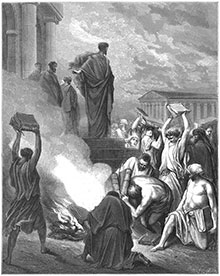 Ілюстрацыі да Дзеяў Святых Апосталаў належаць да фінальнай часткі серыі Дарэ. Чатыры з іх прысвечаны дзеям апостала Паўла. Першы аркуш апавядае пра перамогу Паўла ў Эфесе, калі дзякуючы апостальскім казанням і цудам многія людзі прынялі Хрыста. Мастак шмат увагі аддае архітэктурнаму наваколлю, якое не проста служыць дэкарацыяй драматычнай сцэны. На фоне кампазіцыі бачны велічны антычны храм класічных грэчаскіх формаў. Цэнтральная сцэна таксама разыгрываецца каля высокіх прыступак храма, але гэтая антычная пабудова з яе аркадаю мае выразныя рысы рымскай традыцыі. І вось пасярод гэтага абсалютнага панавання паганскага свету велічна ўзвышаецца постаць апостала Паўла. Яна чытаецца цёмным сілуэтам на фоне неба, па якім лятуць і рвуцца лёгкія воблакі. Толькі выява правай рукі Апостала ярка ўспыхвае на фоне ягонага плашча, узнятага ветрам. Рука апостала Паўла паказвае на вогнішча, з якога шугаюць полымя і дым. Эфескія чарадзейнікі вялікай грамадою набліжаюцца да вогнішча і кідаюць у агонь свае кнігі. У гэтай гравюры Апостал паўстае як імперсанальная сіла Хрыстовай праўды, якая перамагае духоўную эліту паганскага свету. Але пакуль што перамога была толькі лакальнаю. Наступная ілюстрацыя распавядае пра тое, як узбунтаваўся Ерузалем і натоўп у храме напаў на Апостала. Жаўнеры павялі яго ў крэпасць, ратуючы ад расправы. Па трактоўцы гэта найбольш тэатральная кампазіцыя. Яе цэнтральная частка выдзелена штучным святлом, жэсты персанажаў падкрэслена выразныя. Нават глядач з галёркі павінен убачыць і зразумець, што адбываецца на сцэне. У фігуры апостала Паўла ёсць сапраўдны пафас — гэта гнаны прапаведнік Хрыста. У яго фігуры (галава пакутліва схіленая на плячо, адна рука ўзнятая да неба, другая прыціснута да сэрца) ёсць боль і смутак, якія столькі разоў увасобіліся ў гераічных вобразах хрысціянскага мастацтва.