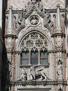 Аднак непасрэдным прататыпам цэнтра кампазіцыі гравюры з’явіўся іншы пластычны твор: архітэктурны комплекс над уваходам у Палац дожаў у Венецыі — над брамай, якая завецца Порта дэла Карта [15]. У атачэнні гатычнага дэкору вылучаецца група: укленчаная фігура чалавека — раскрытая ў вертыкаль кніга — фігура крылатага льва, то бок, у венецыянскай скульптуры і на кніжнай гравюры Скарыны адна і тая ж кампазіцыйная схема. У скульптурнай кампазіцыі прадстаўлены дож Франчэска Фаскары, укленчаны перад крылатым ільвом св. Марка (c); [22]. На гравюры Скарыны, на месцы ўкленчанага дожа — сядзіць прарок Даніэль; раскрытая кніга лягла на калені Прарока; леў застаўся на сваім месцы, але апусціў лапу, а яго крылы «адляцелі» да анёла зверху. Імя і прозвішча дожа сугучныя з імем і прозвішчам вялікага асветніка: Francesco Foscari — Францыск Скарына (у арыгінале — Скорина). Францішак «з слаўнага града Полацка», чуйны да слова, не мог не звярнуць увагі на гэты факт. Скарынаўская выява — не калька і не цытата, але праява вобразна-асацыятыўнага мыслення таго, хто непасрэдна бачыў венецыянскую скульптуру. Такім чынам, у тытульнай гравюры нябачна сышліся тры Францішкі: — святы Францішак з Асізі, дзякуючы якому ў Скарыны з’явілася ідэя слова — выратавання ў дачыненні да постаці Даніэля ў яме з галоднымі львамі; — венецыянскі дож Франчэска Фаскары, імя і прозвішча якога сугучныя з імем і прозвішчам Францыска Скарыны. Скульптурная кампазіцыя, прысвечаная дожу, паўплывала на выбудову цэнтра тытульнай гравюры; — сам геній і вялікі асветнік Скарына, які ўсё аб’яднаў і выступіў як аўтар ідэі ілюстрацыі. Па нашым меркаванні, цэнтральная частка гравюры «Данійлу седящему сольвы …» створана пад уплывам непасрэдных эстэтычных уражанняў, атрыманых у Венецыянскай рэспубліцы, і кніжных рэфлексій Скарыны падчас працы над перакладам Бібліі. У гэтым творы Скарына надзвычай выразна абазначыў самога сябе: свае прэферэнцыі, унутраны свет, адносіны да карыстальнікаў кнігі. Гэта адна з тых гравюраў, пра якія даследчык У. Конан пісаў: «…Ф. Скарына тлумачыў старазапаветныя міфы як падзеі рэальнай гісторыі, якія, аднак, маюць не плоска падзейны, але і сімвалічны сэнс, што мае дачыненне не толькі да мінулага, але і да сучаснага і будучага жыцця… Гаворка ідзе аб прыкметнай мадэрнізацыі старазапаветных сюжэтаў і гравюраў, якія ілюструюць яго Біблію…» (пераклад І. З.), [7, с.187]. Не перастае ўражваць свабода ў творчасці Скарыны — свабода не стыхійная, але інтэлігентная, натхнёная культурай. З пазіцыі сённяшніх рэалій мастацкая інтэрпрэтацыя вобраза Даніэля з кнігай у львінай яме можа выглядаць своеасаблівым піяр-ходам выдаўца ў папулярызацыі кнігі. Распаўсюджванне ведаў праз чытанне — адна з праграмных задачаў вялікага асветніка, прычым кніга гэтая — Біблія, а ў ёй — слова Божае, а яно павінна быць заўсёды побач. Можна сказаць і так: кніга ў руках Прарока — знак, пасланне чытачу і гледачу пра тое, што кніга — жыццёва неабходная рэч і што сіла слова можа быць мацнейшай за сілу мускулаў... «Кніжны» леў натхніў не толькі Францыска Скарыну. Вось радкі: