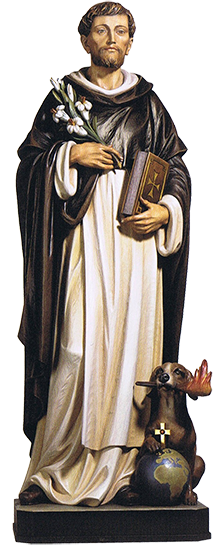 Паданні кажуць, што маці святога Дамініка, благаслаўлёная Ёанна, калі была цяжарная, мела прарочы сон: яна ўбачыла сабаку, які трымаў у зубах паходню і бег па ўсім свеце, распальваючы ў ім агонь. Гэты сон павінен быў значыць, што дзіця, якое мелася нарадзіцца, будзе запальваць на зямлі агонь Божай любові. Гэты агонь павінен быў таксама сімвалізаваць святло праўды, якое разыходзіцца па ўсім свеце праз прапаведнікаў Евангелля ў духу навучання святога Грыгорыя Вялікага, які зрабіў адным з хрысціянскіх сімвалаў вобраз сабакі — прапаведніка пры Боскім Пастыры Хрысце. Сабака з паходняю ў зубах стаў таксама сімвалам ордэну дамініканаў, лацінская назва якога — Domini canes — перакладаецца як «Божыя сабакі». Пра жыццё святога мы ведаем з біяграфіі, напісанай адным з яго першых паслядоўнікаў — Ярданам Саксонскім. Ён апісвае, што аднойчы, падчас дыпламатычнага падарожжа ў Данію праз Паўднёвую Францыю, Дамінік усю ноч правёў у дыскусіі з адным з ерэтыкоў-катараў, спрабуючы пераканаць яго вярнуцца да каталіцкай веры. Пасля таго, як гэты чалавек выракся ерасі, у Дамініку пачала ўзрастаць думка стаць вандроўным тэолагам-прапаведнікам. Такім чынам, два элементы веры павінны былі стаць падмуркам новай манаскай супольнасці: апостальства ва ўбостве, посце, самаўтаймаванні і вандроўнае прапаведаванне ад вёскі да вёскі, ад горада да горада, каб не чакаць людзей, якія шукаюць Бога, а знаходзіць іх самім. Вяртаючыся з Даніі, Дамінік застаўся ў Паўднёвай Францыі, каб прысвяціць сябе прапаведаванню і змаганню з ерассю катараў. У 1206 годзе ўзнікла першая дамініканская супольнасць: у французскім мястэчку Пруйль, недалёка ад Фанжо, быў заснаваны першы кляштар дамініканскіх манашак. Ордэн нарадзіўся ў складаныя для Касцёла часы і ў тым месцы, дзе асабліва адчуваўся крызіс Касцёла. У Еўропе множыліся ерасі, паўднёвая Францыя была галоўным месцам дзейнасці секты катараў — там гэты рух квітнеў, далучаючы прадстаўнікоў усіх саслоўяў. Мужчыны катары найчасцей вандравалі, прапаведуючы сваё вучэнне, а жанчыны жылі вялікімі супольнасцямі ў дамах, якія фундавала мясцовая арыстакратыя. І першымі манашкамі дамініканкамі сталі менавіта катаркі, якіх святы Дамінік навярнуў у каталіцтва. Кляштар святой Марыі ў Пруйлі стаў альтэрнатываю для жанчын, якія жадалі вярнуцца ў Каталіцкі Касцёл, але выраслі ў катарскіх сем’ях і таму надавалі вялікае значэнне аскетычнасці жыцця, пакуце і малітве, чаго бракавала Касцёлу, які перажываў вялікі крызіс. Прыклад любові, веры і аскетычнага жыцця святога Дамініка прывёў іх да навяртання. Дамінік, адораны вялікім духам апостальства, стаў іх духоўным айцом і кіраўніком. Магчыма, сутнасць дамініканскага ордэну і яго яснае бачанне нарадзіліся ў святым Дамініку менавіта пасля навяртання катарскіх жанчын. Ён пажадаў, каб у месцы духоўнай згубы ўзнікла супольнасць, якая несла б святло праўды і стала знакам жывой прысутнасці Хрыста. Дамініканскія манашкі занялі асаблівае месца ў евангелізацыйным служэнні. Ведаючы, што плённасць абвяшчэння Евангелля цесна звязаная з малітваю, Дамінік далучыў манашак з заснаванай ім супольнасці да сваёй справы прапаведавання праз іх заступніцкую малітву. (Цяпер на тэрыторыі Беларусі, на жаль, няма кляштара дамініканскіх манашак, але некалькі сясцёр беларусак жывуць у кляштары ў Дрохедзе, у Ірландыі.)