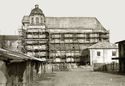 У 1938 годзе, неўзабаве пасля арышту святара Пятра Аўгла (1861–1937), касцёл у Магілёве быў зачынены «па просьбе веруючых». Будынак перадалі МУС БССР, і там размясціўся абласны архіў. У 1944 годзе набажэнствы ў катэдральным касцёле ўзнавіліся. Вялікую ролю ў гэтым адыграў ксёндз Мечыслаў Вацлававіч Малыніч (1888–1969), які арганізаваў парафіянаў і праводзіў набажэнствы. Веруючыя спраўна ўносілі ў гарадскі фінансавы аддзел усе неабходныя плацяжы — страхоўку, зямельную рэнту, падаткі з пабудоваў. Быў створаны і касцёльны камітэт на чале з Я. В. Лыскоўскім. Як адзначаў упаўнаважаны Савета па справах рэлігійных культаў, «дзейнасць касцёла насіла адкрыты і масавы характар — на набажэнствах прысутнічала ад 500 да 1000 чалавек, прычашчаліся і спавядаліся да 1000 чалавек штогод, хрысцілі да 100 дзяцей». Аднак афіцыйна, нягледзячы на зварот веруючых, каталіцкая парафія ў Магілёве так і не была зарэгістраваная. 26 чэрвеня 1947 года Мечыслаў Малыніч быў арыштаваны і прыгавораны да 7 гадоў папраўча-працоўных лагераў за «антысавецкую агітацыю». Пасля яго арышту набажэнствы ў касцёле спыніліся, і неўзабаве ў будынку размясціўся Цэнтральны дзяржаўны архіў БССР. Знутры памяшканне пераабсталявалі: была зроблена новая ацяпляльная сістэма, на верхніх ярусах былых хораў з’явіліся кабінеты супрацоўнікаў і стэлажы для захавання фондаў. Будынак змяніўся і знешне — былі знятыя крыжы, прадугледжвалася разабраць і бакавыя купалы-вежы. Такім чынам, да 1949 года (завяршэнне рэгістрацыі рэлігійных супольнасцяў) у Магілёўскай вобласці так і не з’явіліся афіцыйна дзейныя касцёлы і святары. Публічнае рэлігійнае жыццё католікаў фактычна спынілася яшчэ з 1947 года. Толькі ў 1950 годзе ўзнавілася рэлігійнае жыццё ў прыватных кватэрах, а летам католікі пачалі збірацца на «польскіх» могілках. Для Эўхарыстыі, споведзі, хросту некаторыя веруючыя выязджалі ў касцёлы Вільнюса (да 200 чалавек за 1950–1953 гады). Рэлігійнае жыццё католікаў актывізуецца з 1954 года ў выніку змены агульнай палітычнай атмасферы ў краіне і амнісціравання рэпрэсаваных святароў. Так, у чэрвені 1954 года з ссылкі вярнуўся Мечыслаў Малыніч. Ён пасяліўся ў Слуцку і, не атрымаўшы дазволу ад уладаў, пачаў пакрыёма выконваць абавязкі ксяндза: адпраўляў набажэнствы, хрысціў і вянчаў не толькі ў Слуцку, але і ў Магілёўскай вобласці. Дзякуючы яму адрадзіліся каталіцкія суполкі ў Магілёве, Бабруйску, Асіповічах, Мсціславе. Вернікі пачалі актыўна звяртацца з просьбамі аб рэгістрацыі парафій, адкрыцці касцёлаў. У маі 1954 года ўпаўнаважаны Савета па справах рэлігійных культаў атрымаў хадайніцтва веруючых аб адкрыцці касцёла ў Магілёве. Упаўнаважаны адказаў адмоваю, бо на працягу ўсіх гадоў савецкай улады «католікі абыходзіліся без касцёла і не ўзнімалі пытання ў вызначаным парадку». У жніўні 1954 года веруючыя Магілёва звярнуліся ў Савет па справах рэлігійных культаў у Маскве з просьбаю адкрыць у горадзе касцёл ці капліцу і запрасіць ксяндза з Літвы або Заходняй Беларусі. Свае подпісы пад заяваю паставілі 233 чалавекі. Рашэнне пытання было перанакіраванае ў Магілёўскі аблвыканкам, які, пасля разгляду просьбы ў лютым 1955 года, адмовіў вернікам. Прычынамі былі названыя: немагчымасць перанесці архіў з будынка былога касцёла, а таксама вялікая колькасць грошай, выдаткаваных на яго пераабсталяванне. Вернікам адмовілі таксама і ў