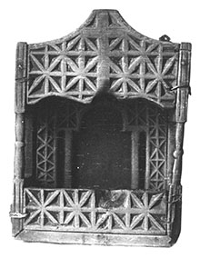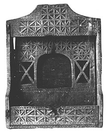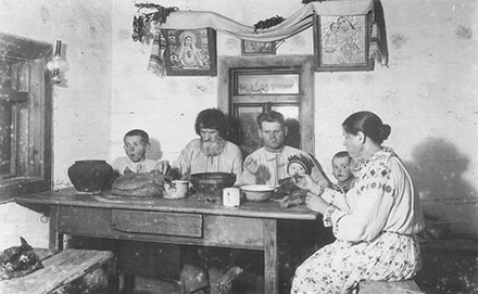 Працяг. Заходняе Палессе Этнограф П. Шэін пра Заходняе Палессе (ён не падзяляў Палессе на рэгіёны, аднак матэрыялы ён збіраў менавіта ў заходняй частцы) заўважыў, што: «В хатах, кроме стола и скамьи да лав, ничего нет. Стены голые: ни образов, ни картин нет, только местами видны деревянные крючки, вбитые в стены…»1. І далей ён працягвае: «Украшений домов крестьянами не наблюдается. Даже во многих домах икон не встретите»2. У якасці прыкладу ім абрана сяло Жытлін Слонімскага павета (цяпер у Івацэвіцкім раёне Брэсцкай вобл.). Верагодна, у больш аддаленых паўднёвых мясцінах — у глыбіні Палесся, а таксама на паўднёвым усходзе, этнограф зафіксаваў бы іншую карціну. Магчыма, тут меў месца і эканамічна-побытавы складнік. Так, яшчэ ў той час большасць хатаў палілася па-чорнаму, пячэй новага тыпу — з комінам — была адна на 10–12 ранейшых. Адпаведна, упрыгожванне хаты было бессэнсоўным, бо хутка ўсё пакрывалася куродымам: «к тому же нужно прибавить, что стены и потолок чернее сажи от дыму, и вся обстановка говорит столько же о вопиющей бедности, сколько и о поразительной неопрятности»3. Але калі такая сітуацыя і сапраўды існавала на час наведвання П. Шэінам гэтых мясцінаў, то неўзабаве яна змянілася. Калі абразы ў хатах палешукоў сталі масавымі, сказаць складана, аднак у міжваенны перыяд яны зафіксаваны некалькімі фатографамі. На здымку 1928 г. В. Ляхаўца, зробленым у вёсцы Кухоцкая Воля Пінскага павета (цяпер Зарэчанскі раён Ровенскай вобл. Украіны), прадстаўлена сялянская сям’я за сталом4. На фота добра бачна, што ў хаце знаходзяцца як мінімум чатыры абразы. На жаль, якасць выявы не дазваляе разгледзець сюжэты, аднак пра спосаб развешвання іконаў і пакрыццё іх ручнікамі атрымаць уяўленне можна.