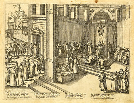 Аўдыенцыя ў Папы Клімэнта VIII Па тых жа табліцах і планах Марціна Ферабоско мы маем магчымасць прасачыць, як віленскія пілігрымы, сярод якіх быў і Ян Пац, праходзілі на аўдыенцыю да Пантыфіка ў суправаджэнні швейцарскіх гвардзейцаў, дарадцаў і служачых дыпламатычнага пратаколу Ватыкана праз дзверы Апостальскага палаца і апынуліся ў Атрыуме, адкуль магчыма было разгледзець рэшткі старой базылікі і фасад новага велічнага сабора святога Пятра з грандыёзным купалам. Тут жа злева была лесвіца, якая вяла ў храм. А прама, напрыканцы Атрыума, была лесвіца пад купалам, якая яднала старую базыліку і Апостальскі палац. Далей па сходах Апостальскага палаца чальцы віленскай місіі падымаліся ў Залу аўдыенцыі. Хутчэй за ўсё, аўдыенцыя праходзіла ў Каралеўскай зале, якая, нібы нартэкс, знаходзіцца перад Сікстынскаю капэлаю (была пабудавана у 1573 годзе). Каралеўская зала выкарыстоўвалася для прыёмаў каралеўскіх асобаў і амбасадараў. У ёй таксама збіраліся калегіі кардыналаў, якія тут жа адпачывалі падчас канклаву. Побач з Каралеўскаю залаю знаходзілася Герцагская зала для афіцыйных цырымоній, таму магчыма дапусціць, што сустрэча Пантыфіка і віленскіх пілігрымаў магла праходзіць і ў гэтай зале. Ва ўсе часы Герцагская зала была часткаю маршрута, па якім манархі і вяльможы ішлі на аўдыенцыю да Пантыфіка. Тут Папа ў Вялікі чацвер абмываў ногі трынаццаці жабракам. У першым памяшканні Герцагскай залы збіраліся кардынальскія кансісторыі, на якіх Пантыфік выслухоўваў пажаданні і прапановы іерархаў Касцёла. Тут прыносіла клятву Папская швейцарская гвардыя. Герцагская зала ў часы Яна Паца складалася з двух памяшканняў, аб’яднаных у 1660 годзе ў адну прастору архітэктарам Берніні. Мовай, якой карысталіся абодва бакі на аўдыенцыі, магла быць адна з трох: польская (магчыма, Пантыфік трохі ведаў яе, бо ў 1588 годзе быў папскім легатам у Рэчы Паспалітай); латынь (сярод сакральных асобаў яна была міжнароднай мовай зносінаў); італьянская (шмат студэнтаў і манахаў з Рэчы Паспалітай вучылася ва ўніверсітэтах Італіі). Згодна з дыпламатычным пратаколам, на аўдыенцыі з боку Ватыкана павінны былі прысутнічаць: кардынал Чынцыё Альдабрандзіні (1551–1610), другі пляменнік Папы Клімэнта VIII, які яшчэ ў 1588 годзе суправаджаў папскага нунцыя Іпаліта Альдабрандзіні падчас перамоваў Святога Пасаду з польскім каралём Жыгімонтам ІІІ у Сілезіі (Рэч Паспалітая), павераны Святога Пасаду ў справах Рэчы Паспалітай; кардынал Джаванні Евангеліста Палотта, архіпрэсвітэр базылікі святога Пятра; біскуп Annibale Ruccellai, прэфект Апостальскага палаца. Імаверна, што падчас аўдыенцыі была закранута тэма Контррэфармацыі і ўмацавання ролі Каталіцкага Касцёла ў Рэчы Паспалітай, і ў гэты момант Ян Пац меў магчымасць распавесці Пантыфіку пра свой шлях з кальвінізму ў каталіцтва. Гэты аповед, відаць, зрабіў вялікае ўражанне на Папу Клімэнта VIII, і ён вырашыў умацаваць веру неафіта годным сакральным падарункам… Але аўдыенцыя ў Апостальскім палацы магла праходзіць згодна з традыцыямі пілігрымак магнатаў ВКЛ у сакральныя святыні на Радзіме, то бок, кожны вернік, які займаў высокае становішча ў грамадстве, ахвяраваў у святыню адпаведную падзяку Нябёсам: падтрымліваў святыню матэрыяльна ці падносіў у дар творы сакральнага мастацтва. Яркі прыклад такіх ахвяраванняў — скарбец у Чэнстахоўскім кляшта