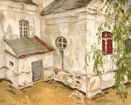 Мястэчка Вішнева з гэтым касцёлам знаходзіцца за 9 кіламетраў ад Багданава. Сувязь карціны Майсея Сляпяна з Фердынандам Рушчыцам — толькі здагадка, але здаецца, што яна найбольш пераканаўчая, хаця не менш праўдападобным мог быць і яго прыезд да сваякоў у напалову яўрэйскае Вішнева ці выкананне прыватнай замовы на напісанне карціны з касцёлам. Магчыма, Майсей Сляпян натхніўся карцінай Фердынанда Рушчыца «Каля касцёла. Нядзеля» (1899) з выяваю багданаўскага касцёла, ці яго аркушамі з накідамі вішнеўскага касцёла пачатку ХХ стагоддзя4. Не выключана, зрэшты, што ён напісаў толькі эцюд з натуры, а карціну выканаў па эцюдзе ўжо ў 1923 годзе ў Мінску. Касцёл у Вішневе Рушчыц пісаў некалькі разоў — акварэллю, з вышыні птушынага палёту, з вадаёмам у 1902 годзе, яшчэ да прыбудовы да галоўнага фасада двухвежавага нартэкса і наўпрост у максімальным набліжэнні, перадаючы асалоду ад яго старадаўняй пластыкі, лепкі сценаў, якія нагадваюць ластаўчына гняздо. Гэтая акварэль праз год была літаграфіраваная. У Майсея Сляпяна старадаўні касцёл зусім іншы. Храм, адлюстраваны на беразе вадаёма на заднім плане з уязной брамай, нібы замёр у спакоі, аднак непазбежнасць навальніцы адчуваецца ў бурных аблоках, у агульнай перадвосеньскай змрочнасці каларыту, агульным настроі смутку — песімізме, эстэтызацыі трывогі, прыхаваным сімвалізме пры рэалізме выканання, эстэтыцы «свету мастацтва», хоць Майсей Сляпян і ўваходзіў у Таварыства імя А. Куінджы, заснаванае ў 1909 годзе. Ён уступіў у яго з-за сваёй захопленасці пейзажамі, якіх стварыў нямала. Відавочна, падзяляў ён і дэкларацыю таварыства: «Аснова нашага мастацтва — прыгажосць і праўда; іх мы выказваем простай і яснай мовай, зразумелай шырокім масам». Гэтага крэда Майсей Сляпян прытрымліваўся ў сваёй творчасці да канца жыцця. Крыніцай яго натхнення стала родная зямля, паэтычныя пачуцці, выкліканыя сціплай, але такой чароўнай прыгажосцю беларускай прыроды, зусім не эфектныя вуліцы роднага Мінску. Усе краявіды пісаліся ім на натуры, на пленэрах, у Мінску і ваколіцах. Толькі па каталогах мінскіх выставаў, на жаль, вядомы яго пейзажы «Першы снег», «Восеньскія матывы», краявіды закінутай ускраіны Мінска — каля Татарскіх агародаў — Людамонта з яго броварамі і парахавымі складамі, эцюды са станцыі Калодзішчы. У Вішневе Майсей Сляпян з многіх ракурсаў абраў бакавы фасад касцёла, адышоўшы ад прыгажэйшага выгляду галоўнага фасада з адлюстраваннем у вадаёме, на беразе якога стаіць касцёл. У вішнеўскім пейзажы з касцёлам яго ўразілі цішыня і спакой, кантраст цвярдыні маналіту старога будынка і дрэваў з неспакойным хмарным небам. «Па ўнутрыжанравай класіфікацыі — гэты твор належыць да „пейзажа настрою“. Але гэта толькі словы... Гэта заўсёды цуд — як мастак здолеў на невялікім палатне звычайнымі інструментамі сказаць так шмат і пра гэтую зямлю, і пра чалавечы лёс», піша Валянціна Вайцэхоўская. «Больш трывога, чым цішыня, гэта — нібы прадчуванне бураў XX стагоддзя, яшчэ больш жорсткіх, чым раней, выпрабаванняў. Храм выстаяў, касцёл Наведвання Марыі Лізаветай і цяпер знаходзіцца ў вёсцы Вішнева Валожынскага раёна Мінскай вобласці»5. Ён не закрываўся нават у гады савецкай улады і Вялікай Айчыннай вайны... Але як гэтая карціна трапіла да Собінавых? Тут можна выказваць толькі здагадкі. На жаль, Алена Аладава не пакінула 