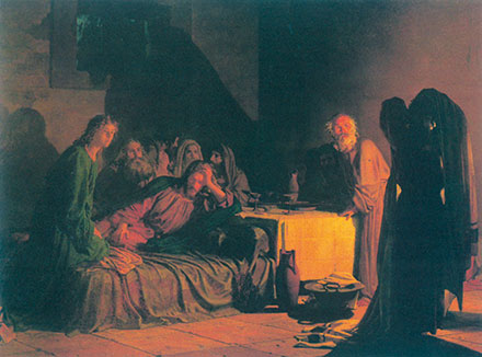 Пецярбургскі мастацтвазнаўца Сафія Караўкевіч напісала пра «Тайную Вячэру» Мікалая Ге: «Змест раскрываецца як філасофскі роздум мастака над сутнасцю жыцця, у гэтым плане ён працягнуў пошукі, распачатыя Аляксандрам Іванавым. Аточаны вучнямі Хрыстус (у Яго вобразе адлюстраваны партрэтныя рысы А.І.Герцэна) супрацьпастаўлены адкінутаму Юду як увасабленню зла, здрады высокім этычным ідэалам. Адмысловае месца ў кампазіцыі належыць асвятленню, у чым бачна творчае праламленне традыцый вялікіх майстроў мінулага»1. Цяжка ўявіць, што гаворка ідзе пра ранні твор зусім маладога жывапісца, якому было крыху за трыццаць. На пачатку свайго творчага шляху Мікалай Ге (1831–1894) намаляваў вялікую па памерах карціну, якая стала адной з самых знакамітых у гісторыі рускага жывапісу. Наперадзе былі дзесяцігоддзі пошукаў і адкрыццяў, але ў прынцыпе ўжо ў гэтым палатне Ге сказаў людзям усё, што хацеў сказаць. Нават марксісцкае мастацтвазнаўства вымушана было лічыцца з гэтым палатном. Яго не адважваліся схаваць у запаснікі, замаўчаць, прымусіць забыцца аб ім. Хітрыя тэарэтызаванні савецкага перыяду («религия тут ни при чём…») не маглі падмануць людзей, якія шукалі ў мастацтве рэлігійную духоўнасць. Аднак, як і многія ягоныя сучаснікі, Ге сутыкнуўся з неразуменнем з боку афіцыйнай царкоўнай іерархіі, якая заявіла, што карціна «надта рэалістычная», і забараніла яе рэпрадуцыраваць. На шчасце, карціну ўпадабаў і купіў для сваёй калекцыі імператар Аляксандр ІІ. Цемрашалы адразу сцішыліся, а кіраўніцтва Пецярбургскай Імператарскай Акадэміі мастацтваў у пазачарговым парадку надало мастаку званне прафесара. Мікалай Ге нарадзіўся ў Варонежы, у сям’і памешчыка, нашчадка французскіх імігрантаў, якія ўцяклі ў Расію з рэвалюцыйнай Францыі (цікава, што бацька мастака ўдзельнічаў у складзе рускай арміі ў акупацыі Парыжа ў 1814 г.). У 1841 г. сям’я пераехала ў Кіеў, дзе пасля заканчэння гімназіі Ге вучыўся на фізіка-матэматычным факультэце мясцовага ўніверсітэта. Юнак працягнуў навучанне ў Пецярбургскім універсітэце, але ў 1850 г. пакінуў факультэт і паступіў у Акадэмію мастацтваў, дзе навучаўся пад кіраўніцтвам П. Басіна. За работы на антычныя і біблейскія тэмы Ге атрымаў акадэмічныя ўзнагароды і быў накіраваны на пенсіянерства за мяжу. Пасля творчай працы ў Парыжы ён пераязджае ў Італію і працуе спачатку ў Рыме, а потым у Фларэнцыі. У Рыме ён пазнаёміўся з сваім вялікім папярэднікам у жывапісе Аляксандрам Іванавым, а ў Фларэнцыі пасябраваў з Аляксандрам Герцэнам, партрэт якога намаляваў і нелегальна пераправіў у Расію. Менавіта ў Італіі Ге намаляваў карціну «Тайная Вячэра» і шэраг іншых работ на евангельскую тэму, але ўсе яны мелі халодны прыём у пецярбургскай Акадэміі. У 1870 г. мастак вярнуўся ў Пецярбург, але ў 1875 г. назаўсёды пераехаў ва Украіну, пасяліўшыся на хутары Іванаўскім на Чарнігаўшчыне. На працягу некалькіх гадоў Мікалай Ге перажываў глыбокі духоўны крызіс, падчас якога не маляваў, шмат думаў і пісаў на рэлігійныя тэмы. З крызісу яго вывеў Леў Талстой, з якім ён пазнаёміўся ў Маскве ў 1882 годзе. Ге пачаў плённа працаваць над евангельскімі тэмамі, але крытыка і публіка не зразумелі ягоных наватарскіх работ. Нават такі шэдэўр, як карціна «Што ёсць ісціна?» (1890), быў зняты з выставы і высмеяны ў прэсе. Жывапісная і вобразная трактоўка хрысталагічнай тэмы бы