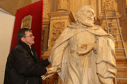 Як толькі Павел Садлей паведаміў, што дазвол атрыманы, мы за два дні паставілі першы ярус. Перад тым, як пачалі працаваць пры алтары, увесь касцёл ачысцілі ад копаці і пафарбавалі. Парафіяне таксама ўключаліся ў працу. Дайшло нават да таго, што адна вельмі адданая Касцёлу старэнькая жанчына, пані Анеля, прынесла срэбныя лыжкі і сказала: «Ойча, грошай я не маю, але Вы прадайце гэтыя лыжачкі і грошы аддайце на алтар». Я быў вельмі ўражаны... Грашовыя ахвяраванні прыносілі многія людзі — мы занатоўвалі іх імёны, але было некалькі такіх, хто прасіў нават не запісваць іх, хоць яны ахвяравалі немалыя сумы. Калі палова страчанай часткі алтара была ўжо зробленая, я пачаў думаць пра скульптуры. І тут выпадкова знайшоўся разьбяр Казімір Місюра (гэта была асобная гісторыя). Я сустракаўся з многімі разьбярамі, але выбраў менавіта яго, бо здавалася, што гэты чалавек прызначаны для такой працы самім Богам. Ён непаспешлівы, не гаварыў, колькі гэта будзе каштаваць, не абяцаў, што зробіць гэта за нейкі канкрэтны час, а сказаў толькі: «Я зраблю, а Вы паглядзіце, ці добра. Калі добра, будзем рабіць далей». Найважнейшае было тое, што ён хацеў пачытаць што-небудзь пра Ёгана Шміта, спазнаць яго дух і думкі, паглядзець яго працы. Толькі пасля гэтага Казімір Місюра пачаў выразаць скульптуры. Здаралася, што я адчуваў прыгнечанасць, калі трэба было разлічвацца з майстрамі, а грошай амаль не было.... Нават хацеў аддаць у заклад свой аўтамабіль. Але Бог, дапускаючы выпрабаванні, ніколі не пакідае нас без выйсця. У такія моманты раптам прыходзіў які-небудзь спонсар, каб ахвяраваць грошы на скульптуру. Гэта сапраўды была вялікая Божая ласка! Напэўна, мы атрымалі яе праз заступніцтва Маці Божай Кангрэгацкай. Уявіце: увесь алтар гарэў; на аргане, які знаходзіцца за 60 метраў ад алтара, адслаілася фарба, а алтар Маці Божай быў за 3 метры ад цэнтра пажару і з ім нічога не сталася. Нават фіранка, якая аддзяляе прэзбітэрый ад алтара Маці Божай Кангрэгацкай, засталася цэлая і вісіць да сённяшняга дня. А гэта ж сукно, якое павінна было згарэць, як порах! Не трэба баяцца, калі Бог пасылае нам выпрабаванні. Алтар і дагэтуль трэба было рэстаўраваць, але за яго ніхто б не ўзяўся. Пажар проста падштурхнуў нас. Цяпер, гледзячы на ўсё нібы з боку, я разумею, што ў гэтым была воля Божая. Хоць алтар ужо скончаны, працы па ўсім касцёле працягваюцца яшчэ і сёння: мы аднавілі і пачысцілі фрэскі, падзалацілі капітэлі. Да гэтага часу касцёл быў нібы прыгаслы, а цяпер набыў сакральнасць. Я заўважыў, што і людзей стала больш прыходзіць — не толькі на святую Імшу, але проста пабыць у касцёле, памаліцца, пасузіраць створаную прыгажосць. Зразумела, было шмат незадаволеных, якія папракалі мяне ў тым, што я нібыта выдаткоўваю на алтар зашмат фінансаў. Адна вельмі пабожная бабулька дакарала мяне: «Што Вы тут наладзілі! Мой унук узяў папырскаў балончыкам на рамачку — і яна пазалацілася. А Вы столькі грошай валіце!» З-за такога неразумення прыходзілі хвіліны адчаю, але Бог нібы казаў мне: «Паглядзі, 300 гадоў таму людзі зрабілі, і сёння вы маеце». Галоўны алтар яшчэ ніколі не быў пазалочаны, хоць у дамове паміж езуітамі і Ёганам Шмітам было напісана: «Падрыхтаваць разьбу да пазалачэння...». Я думаю, што зрабіць гэта ў той час перашкодзіў недахоп фінансаў, таму што бакавыя алтары былі ўжо пазалочаныя. Галоўны алтар быў т
