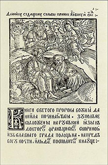 Сярод пражскіх выданняў Францыска Скарыны, надрукаваных у 1519 г., знаходзіцца кніга пад назвай «Книги Данийла Пророка» («Книги светого пророка Божия Данийла»). Яе тытульны аркуш мае гравюру з тлумачальным тэкстам уверсе: «Данійлу седящему сольвы принесе Абвакум обед» [1, гравюра 6; 3, с. 697]. Гравюра адносіцца да сюжэтна-тэматычных, апавядальных ілюстрацый. На наш погляд, яна з’яўляецца адной з найбольш неардынарных сярод іншых у Бібліі Скарыны, а для яго асабіста — адной з найбольш значных. Як нам бачыцца, па крытэрыях суб’ектыўнасці і выяўлення аўтарскай індывідуальнасці яе можна паставіць побач з аўтапартрэтам Скарыны. Яна зусім не такая наіўная, як можа падацца на першы погляд, хоць і мае відавочныя рысы наіўнасці. Паводле сённяшніх мастацтвазнаўчых поглядаў, гравюру можна аднесці да твораў інсітнага мастацтва. Насычаная візуальнай інфармацыяй, з вялікай колькасцю персанажаў, напоўненая падрабязнасцямі, гэткая «блокбухаўская» ілюстрацыя прызначалася для маласпрактыкаванага чытача, а яшчэ больш — для непісьменнага, але цікаўнага слухача [10, с. 110]. Аднак «карцінка» з бегам часу стала цікавай і для даследчыкаў. «Книги Данийла Пророка» (далей — Кніга) — адна з прарочых частак Старога Запавету. Аўтарства яе прыпісваецца біблійнаму прароку Даніэлю, нашчадку юдэйскіх нобіляў, які жыў на пераломе VII–VI стст. да н.э. У юным узросце разам з тысячамі сваіх супляменнікаў ён быў выведзены ў бабілёнскі палон [4, c. 185; 13, 23]. Нягледзячы на свой нізкі сацыяльны і, умоўна кажучы, нацыянальны статус (быў палонным і іншапляменным), Даніэль заняў пасаду першага дарадцы пры царскіх асобах бабілёнскага двара дзякуючы сваім прыродным і духоўным якасцям. Адна з іх — дар адгадваць сны і тлумачыць іх сэнс. Высокае становішча рабіла Даніэля мішэнню ў інтрыгах зайздросных саноўнікаў. У Кнізе апісваюцца гісторыі з жыцця гэтага чалавека і падзеі, сведкам якіх ён быў (a) [2, с. 1273-1299; 13, 14, 24]. Многія з гэтых разнастайных і глыбокіх па змесце гісторый знайшлі адлюстраванне ў выяўленчым мастацтве. Для тытульнай гравюры Францыск Скарына абраў адзін з найбольш драматычных эпізодаў жыцця Даніэля — яго цудоўнае выратаванне ад смерці ў яме з галоднымі львамі. У цэнтры гравюры (105 х 104 мм) вока гледача бачыць галоўнага персанажа, які сядзіць у атачэнні ільвоў, не раз’юшаных, але ціхмяных і лагодных. Зверху — група з чатырох чалавек, адзін з якіх, пасярэдзіне, у кароне — цар бабілёнскі, па баках — яго прыдворныя, ніжэй — слуга. Яны прыйшлі паглядзець, што сталася з Даніэлем, кінутым у львавярню. Справа зверху — анёл, які трымае чалавека за валасы; у руцэ чалавека кошык з ежай — гэта прарок Авакум. Усё дакладна паводле тэксту, апроч аднаго — кнігі на каленях Даніэля, аб’екта зусім нечаканага для гэтага эпізоду. Выявіць прарока Даніэля з кнігай было б абсалютна правамерным, бо ў аповедзе пра яго ёсць пасаж, у якім згадваецца сакральная кніга з таямніцай абраных для вечнага жыцця імёнаў, даручанай Прароку (Дан 12, 1.4). Такім, дарэчы, ён і прадстаўлены ў фрэскавым роспісе Мікеланджэла на скляпеннях Сікстынскай капэлы [16]. Даніэль з ільвамі — таксама бясспрэчны эпізод. Але прысутнасць пры Даніэлю і кнігі, і львоў на адным выяўленчым полі выглядае нейкім каламбурам, «прыколам». Тым не менш, Скарына, аб’яднаўшы гэтыя аб’екты — кнігу і львоў — у адным сюжэце, не запярэчыў біблійнам