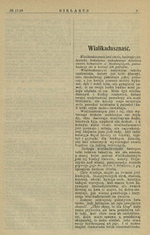 7 жніўня 1914 года. Пішуць да нас. З Свянцяншчыны. Віленскай губерні. Богу дзякаваць, Вера Хрыстусовая ўсё глыбей, мацней і разумней усочываецца ў наш народ беларускі, не бачучы на тыя адпадкі, якія спраўляюць нам шырыцелі бязбожнасці. Аднак ня ўсюды так ёсць. Дужа многа ёсць у нас людзей цёмных «даўнейшых», што мяшаюць яшчэ рэлігію з забабонамі, вераць усялікім старым дурноцтвам, думаючы, што не працівяцца Веры ў Бога. Тымчасам гэта пахнець паганствам <...>. А ёсць-жа ў нас поўна розных чараў, замоваў, каторыя маюць памагаць ад хваробы, дзякуючы толькі пустой брэдні шаптуна, або яго смешнай малітве. Захварэе дзіця, — матка нясе яго да такога махляра, каторы змерыць дзіцянё ніткай, возьме заплату і скажа: «Будзе здаровае». <...> Шаптунства, замовы, варажба, чараўніцтва — путаюцца па цёмных галовах. Каб гэта цемра чымхутчэй кончылася, трэба пільна старацца ня прымешваць да забабонаў ніякіх мадлітваў, бо між мадлітвай і забабонамі німа нічога супольнаго — як між агнём і вадой — а з другой стараны, дзе гэта смяхота забабонаў знайдзіцца, трэба або зусім яе касаваць, або змяніць на гульню, забаву, каб ні знаку там не было таго няразумнаго спадзеўку.