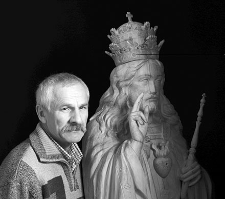 …Калі Казімір Місюра, пазваніўшы мне, сказаў, што ў аўторак 15 сакавіка прывязе да сябра Антона Ляшчынскага на фатаграфаванне скульптуру Езуса Валадара Сусвету, якую выразьбіў для правага праёма алтара для бабруйскага касцёла Беззаганнага Зачацця Найсвяцейшай Панны Марыі, я пачала ўяўляць, якога ж Езуса выразьбіў Казімір Місюра. Хлопцы з Літвы на пленэры ў Гродне называлі Казіміра «акадэмікам», бо ён стварае сапраўды класічныя вобразы ў дрэве, дасканалячы кожную дэталь, думаючы аб прапорцыях цела, аб памерах. Гледзячы, як гэты скульптар выгладжвае складкі на разьбяным адзенні, я думала пра тое, што яго можна назваць краўцом-мадэльерам, а прычоскі святым скульптурам у дрэве Казімір робіць так, што пазайздросцяць цырульнікі... Трэба было арыентавацца на левы бочны алтар у бабруйскім касцёле, дзе ўжо знаходзіцца створаная Казімірам Місюрам скульптура Маці Божай Будслаўскай з Дзіцем Езусам. Пробашч Андрэй папрасіў выразьбіць Сына Божага на 10 сантыметраў вышэй, а ўся вышыня скульптуры складае два метры. Калі скульптар працаваў над вобразам Маці Божай Будслаўскай, у думках укладваў і вобраз Езуса Хрыста па другі бок цэнтральнага алтара, таму над гэтай скульптурай працаваў больш смела — усё было ўкладзена ў галаве. Працаваў у натхненні і з усёй аддачаю — бывалі такія дні, што меў сілы працаваць па 17 гадзін! Казімір Місюра зрабіў знутры бервяно ліпкі пустым, каб яно было лягчэйшым. Уся праца заняла паўгода... Бог, якога ён «вымольваў» з ліпы, відавочна кіраваў яго разцом. Талент і праца стварылі скульптуру Езуса Хрыста, Божага Сына, які адкупіў грахі людзей і навечна валадарыць светам. Ён увойдзе ў адзін з пакрыўджаных людзьмі касцёлаў — там да будынка святыні ў 1968 годзе прыбудавалі адміністрацыйны дом на пяць паверхаў, «утапіўшы» неаготыку ў пачварным будынку. Але Бог не пакінуў Бабруйск… Скульптар выразьбіў вобраз Сына-Бога, Валадара Сусвету. Мы нарэшце маем нашага Караля ад Воранава да Бабруйска праз Гродна і Мінск! Ён добры, сур’ёзны, разумны, не штучны. У Яго выразныя вочы, тутэйшыя вусны, злёгку ўпалыя шчокі, ямка на падбародку. Пра валасы я ўжо сказала — у Бога на галаве шмат валасоў. Дочкі скульптара, Вера і Алена, рабілі заўвагі бацьку: «Даклей носа, прыбяры падбародак». А Бог маўчаў, таму Казімір не слухаў сваіх разумных дачок. Бог стаіць моцна на абедзвюх, не сагнутых у каленях нагах, правая крыху выступае наперад. У левай руцэ трымае бэрла, ім і кіруе ўсім белым светам (бэрла з арэхавага кійка), а правай рукой благаслаўляе нас на жыццё, дарогу і праўду. Залатая карона — з двух ярусаў. Белая кашуля і барвовы плашч натуральнымі хвалямі аблягаюць постаць звычайнага чалавека, бо Ён стаўся Чалавекам, але галоўнае ў скульптуры — гэта сэрца, якое б’ецца паверх рэбраў, паверх грудзей, паверх кашулі. Сэрца палае полымем укрыжаваным… Я гавару пра колеры, якія накладуцца ўжо пасля… У сучасных касцёлах любяць паліхромію. Накладваць паліхромію на гэты раз прыедзе з Кракава Чэслаў Колышка, ксёндз і былы вучань Казіміра Місюры родам з Ліды. У той вечар Казімір, які звычайна ахвотна гаворыць сам, быў маўклівы, і выцягнуць з яго нейкае слова прызнання было немагчыма. Яго сябра, з якім вучыліся ў віцебскім інстытуце, кіраўнік кафедры, прафесар Гродзенскага ўніверсітэта Антон Ляшчынскі, працаваў з фотаапаратамі і рознымі прыладамі — падсвет