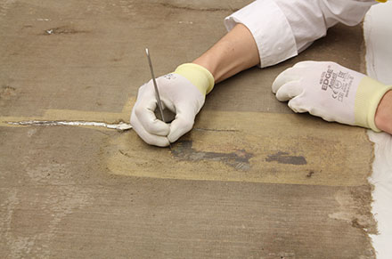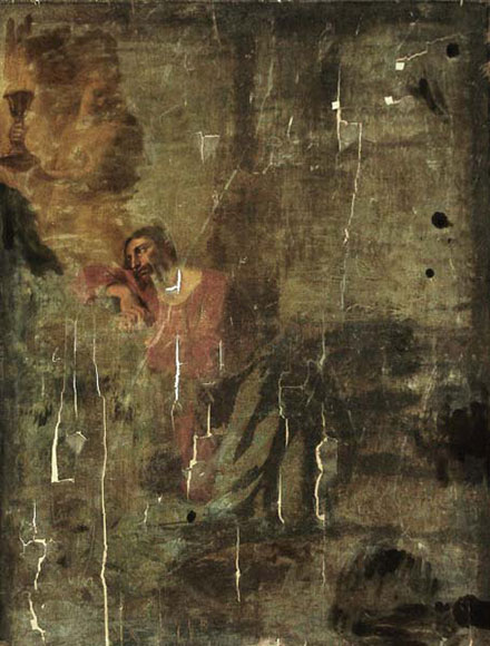 3. Выдаленне дэструктыўнага лаку, які страціў аптычныя ўласцівасці, з фарбавага слою жывапісу. ...Запыленае палатно памерам тры на тры метры прывезлі з экспедыцыі па «зачыненых культавых памяшканнях» яшчэ ў 1970-я. З асцярогаю расклалі на падлозе: здавалася, што старое палатно з разрывамі рассыплецца пад рукамі. Выява не чыталася. Паглядзелі, згарнулі ў рулон і змясцілі ў НДФ — навукова-дапаможны фонд, пад нумарам 2207. І гадоў на сорак быццам забылі. Тады ў музеі нават не было вялікага стала, таму што не было вялікай майстэрні. Не было і кваліфікаваных спецыялістаў. Іх увогуле не было. І незразумела было, што гэта за палатно. Не было магчымасці даследаваць. З часам многае змянілася, і аднойчы, правяраючы захаванасць палотнаў на рулонах, праверылі і НДФ–2207. Аварыйны стан палатна патрабаваў тэрміновага паратунку, апрача таго, ужо можна было даследаваць жывапіс, каб вызначыць яго месца ў калекцыі музея. ...Замацавалі аснову жывапісу і фарбавы слой. Расчысціўшы жывапіс ад памутнелага лаку, убачылі ў залатым ззянні анёла з чашаю і спакутаваныя вочы Збаўцы. «З’явіўся Яму анёл з нябёсаў і ўмацаваў Яго...»
