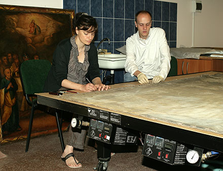 1. Замацаванне асновы і фарбавага слою жывапісу з дапамогаю BEVA–374. ...Працэс рэстаўрацыі — гэта амаль медытацыя. Аднастайная праца патрабуе напружанай увагі, але падчас яе ў галаву прыходзяць самыя розныя думкі, тым больш, што на стале не праца невядомага мастака, а, напэўна, сапраўды, знакамітага Яна Дамеля. Вядома, што Ян Дамель пісаў карціны на гістарычныя тэмы, партрэты, пейзажы, шмат працаваў для касцёлаў, паспяхова праяўляючы сябе ў розных стылях — і класіцызм, і неакласіцызм, і рамантызм былі падуладнымі яго пэндзлю. У музеях Літвы, Польшчы і Расіі карціны мастака займаюць пачэсныя месцы. У Беларусі захаваліся ўсяго тры яго творы: «Святы Юзаф з Дзіцяткам Езусам» у вішнеўскім касцёле; «Святая Канстанцыя» — у Нацыянальным мастацкім музеі; «Вызваленне Паўлам І Касцюшкі» — у музеі Ваньковічаў у Мінску. Аднак ці ўсе гэта ведаюць? Як і тое, што Ян Дамель — беларускі мастак. Гавораць жа некаторыя, што гэта творца, так бы мовіць, трайной нацыянальнай прыналежнасці, а «па месцы адсідкі, несумненна, рускі». Спадабаўся яго пейзаж «Захад сонца ў Табольску» — дык можна і ў рускія мастакі запісаць! Калі ісці за такою логікаю, то і кардынал Свёнтэк, які «па месцы адсідкі» 10 гадоў правёў у Гулагу ў Інце і ў Варкуце, «таксама рускі», і такіх «рускіх» на постімперскай прасторы, і царскай, і савецкай, проста безліч — бяры і ўзбагачай рускую культуру! Ян Кшыштаф Дамель (1780–1840) нарадзіўся ў Курляндыі, у Мітаве (цяпер Елгава, Латвія). Скончыў Віленскі ўніверсітэт. 1820–1822 гг. правёў у ссылцы ў Табольску, Томску і Енісейску. З 1822 г. жыў у Мінску, дзе і пахаваны на «могілках мінскай арыстакратыі» — так назваў Уладзіслаў Сыракомля Кальварыйскія могілкі. І лепшы свой твор, сваю апошнюю карціну, Ян Дамель напісаў у Мінску, і цяпер яна рэстаўруецца ў Нацыянальным мастацкім музеі Беларусі. Рэстаўрацыяй кіруе Аляксандр Лагуновіч, а дапамагаюць яму Святлана Ішмаева, Сяргей Шаціла і Кацярына Грачова. Праца працягваецца паўгода і блізкая да завяршэння. 2. Расчыстка адваротнага боку палатна. ...Чамусьці амаль заўсёды трэба даказваць, што гэта беларускае, а не польскае ці літоўскае, ці якое-небудзь яшчэ. Вядомая гісторыя. Гісторыя Беларусі, якую мы ўяўляем, чытаючы Адама Міцкевіча (чый ён?) і Францішка Багушэвіча (мужыцкі адвакат!). Гісторыя Беларусі, якую мы ўсё яшчэ адкрываем, у тым ліку праз Караткевіча і праз фотаздымкі Яна Булгака, углядаючыся ў твары і пейзажы ў амаль містычным нетутэйшым святле... Зрэшты, у гэтым выпадку ніхто нічога не аспрэчвае і не даказвае. Проста на рэстаўрацыйным стале ляжыць палатно, якое пакуль цяжка назваць карцінаю, але рэстаўрацыя дакажа, што гэта карціна, і належыць яна пэндзлю Дамеля, які жыў і працаваў у Мінску.