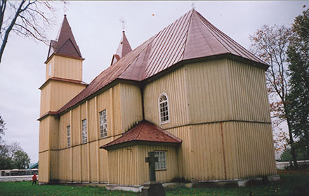 Каталіцкая парафія ў в. Дуды (Іўеўскі р-н) была заснаваная ў 1608 г. вялікім гетманам літоўскім Каралем Хадкевічам. Першы драўляны касцёл Нараджэння Найсвяцейшай Панны Марыі быў пабудаваны ў 1672 г. па фундацыі караля Рэчы Паспалітай Міхала Вішнявецкага; адбудаваны пасля пажару ў 1772 г. «з дрэва цёсанага» на сродкі мясцовага старосты Гераніма Зянковіча і яго жонкі Барбары; асвячоны ў 1781 г. біскупам Т. Зянковічам. Адноўлены ў 1908 г. і ў 1990-я гады. Класічны ўзор сармацкага барока ў дрэве, відавочна, меў за ўзор мураваныя касцёлы ў Міхалішках і Засвіры. Прамавугольны асноўны і пяцісценны алтарны зруб накрыты агульным двухсхільным дахам з вальмамі над алтаром. Па баках алтарнай апсіды размешчаны квадратныя ў плане невысокія сакрыстыі, накрытыя вальмавымі дахамі з дыяганальным вільчыкам (форма пакрыцця характэрная для гэтага рэгіёна). Галоўны фасад фланкуюць дзве сіметрычныя, квадратныя ў плане вежы, шырыня якіх абумоўлівае памеры ўнутранага бабінца. Вежы маюць тры чацверыковыя ярусы, якія злёгку скарачаюцца ўгору, што надае кампазіцыі фасада вертыкальную дынаміку. Паводле фотаздымка пачатку ХХ ст., вежы завяршаліся пакатымі шатрамі з заломам і васьміграннымі грушападобнымі галоўкамі-«банькамі»; у наш час яны завершаны высокімі неагатычнымі шатрамі з трохвугольнымі франтонамі ў аснаванні граняў. Цэнтральная частка фасада заглыбленая паміж вежамі і завершаная атыкавым франтонам. Помніку ўласцівая строгасць і лапідарнасць вонкавага аблічча ў спалучэнні з багатаю аздобаю інтэр’ера. Унутры драўляная столь навы і прэзбітэрыя імітуе люстэркавае скляпенне з арнаментальнаю размалёўкаю ў стылі мадэрн. Над бабінцам размешчаны арганныя хоры. Тры познебарочныя алтары маюць калоны карынфскага ордэру і дынамічна раскрапаваныя антаблементы з ракайльнымі картушамі. Каталіцкая парафія ў м. Свіслач (Асіповіцкі р-н) была заснаваная ў 1600 г. Мікалаем Гарабурадам, кашталянам мінскім. Драўляны касцёл пад тытулам св. Барбары быў збудаваны па фундацыі Барбары Незабытоўскай (з Завішаў) у 1783–1786 гг. Гэта быў двухзрубавы храм базылікальнай канцэпцыі з дзвюма чацверыковымі вежамі на галоўным фасадзе і трохвугольным франтонам паміж імі. Паводле інвентара 1854 г., ён быў пабудаваны з брусоў, меў «бабінец унутраны», злева ад яго была лесвіца на хоры, падмурак з бутавага каменя (НГАБ, Мінск, ф. 1781, воп. 27, спр. 274, арк. 1). Драўляны парафіяльны Троіцкі касцёл у в. Амнішава (Лагойскі р-н) пабудаваны ў 1795–1797 гг. па фундацыі Юзафа Корсака і яго маці Анэлі (з Байкоўскіх). Двухзрубавы храм з пяцісценнаю алтарнаю апсідаю быў накрыты агульным высокім шматсхільным гонтавым дахам з падоўжным вільчыкам. На галоўным фасадзе над карнізам даха ўзвышаліся дзве чацверыковы вежы, накрытыя шатрамі-«каўпакамі», і значных памераў франтон, які імітаваў атыкавыя франтоны тагачасных мураваных святыняў позняга барока. Верхняя частка франтона мела пластычны абрыс і барочныя валюты па баках. Сцены былі ашаляваныя вертыкальна дошкамі з нашчыльнікамі, вокны мелі лучковыя завяршэнні. У інтэр’еры была намаляваная «на оптыку» алтарная кампазіцыя. З боку, «у адну лінію з фасадам», стаяла каркасная чацверыковая званіца, накрытая гонтавым шатром-«каўпаком». Драўляны парафіяльны касцёл Нараджэння Найсвяцейшай Панны Марыі ў в. Куранец (Вілейскі р-н) быў пабудаваны ў 1652 г. Паводле інвентара 1798 