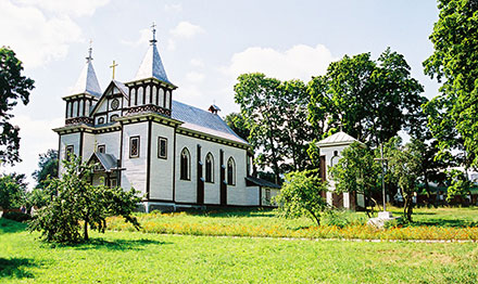 Заканчэнне. Пачатак у № 2 за 2017 г. Першы касцёл св. Уладзіслава ў в. Суботнікі (Іўеўскі р-н) быў заснаваны ў 1545 г. каралём Жыгімонтам І Аўгустам (фундацыя замацавана ў 1573 г. Альбрыхтам Радзівілам). У 1755 г. уладальнікамі маёнтка Юрыем і Марыяй Абрамовічамі быў пабудаваны новы драўляны двухзрубавы касцёл базылікальнай канцэпцыі з двухвежавым галоўным фасадам-нартэксам, з барочным франтонам і ўваходным порцікам. У 1900–1928 гг. быў змураваны новы храм у стылі неаготыкі па фундацыі Уладзіслава і Яніны Умястоўскіх. Драўляны касцёл Міхала Арханёла ў в. Барань (Барысаўскі р-н), паводле стылёвых прыкметаў, пабудаваны ў сярэдзіне XVIII ст. Яго выява прадстаўлена ў польскамоўным «Апісанні павета Барысаўскага» 1847 года. Гэта двухзрубавы храм базылікальнай канцэпцыі з двухвежавым фасадам-нартэксам з рысамі сармацкага барока. Чацверыкі вежаў былі накрытыя пакатымі шатрамі з заломам, увенчанымі гранёнымі «банькамі». Па баках пяціграннага алтарнага зруба мясціліся невялікія квадратныя сакрыстыі, накрытыя двухсхільнымі дахамі з дыяганальнымі вільчыкамі. Драўляны касцёл у Дамбровіцах (б. Гродзенскі п., цяпер Польшча) быў заснаваны ў 1594 г. уладальнікам маёнтка, гродзенскім ваяводам Пятром Весялоўскім, перабудаваны ў XVIII ст. Двухзрубавы храм базылікальнай канцэпцыі пабудаваны ў традыцыях заходнепалескай рэгіянальнай школы. Надзвычай высокі вальмавы гонтавы дах меў трохвугольныя застрэшкі ў месцы злучэння квадратнага асноўнага і пяціграннага алтарнага зрубаў, а на галоўным фасадзе завяршаўся трохвугольным франтончыкам з шырокім прычолкам паміж дзвюма чацверыковымі вежамі, увенчанымі «банькамі». Па баках апсіды размешчаны невысокія сакрыстыі з рамбічнымі вокнамі, пры ўваходзе — невялікая крухта. Меў традыцыйную вертыкальную шалёўку з нашчыльнікамі і прамавугольныя вокны. Асобна стаяла двух’ярусная званіца (чацверык на чацверыку), накрытая пакатым шатром-«каўпаком». У краязнаўчай літаратуры занесены ў «цуды польскія». Юр’еўскі касцёл у в. Паланечка (Баранавіцкі р-н) быў пабудаваны ў 1751 г. у стылі барока па фундацыі біскупа Жалкоўскага, у 1899 г. рэканструяваны (арх. К. Вайцяхоўскі). Гэта двухзрубавы храм базылікальнай канцэпцыі з двухвежавым галоўным фасадам. Выцягнуты прамавугольны асноўны зруб і пяцігранная апсіда прэзбітэрыя аб’яднаныя агульным дахам з падоўжным вільчыкам. Галоўны фасад раскрапаваны па баках двух’яруснымі вежамі (чацверык на чацверыку), завершанымі высокімі шатрамі. Першапачаткова ў завяршэннях вежаў спалучаліся пакатыя шатры з пукатымі купалкамі. Пасля рэканструкцыі верхнія чацверыкі вежаў, франтон і фасады атрымалі арыгінальны неагатычны дэкор. Бакавыя фасады аздоблены стральчатымі абрамленнямі вокнаў і вертыкальнымі сцяжкамі, якія імітуюць ступеньчатыя контрфорсы, характэрныя для мураванага дойлідства гэтага рэгіёна (касцёл у Ішкалдзі, уніяцкая царква ў Вольна). Абапал прэзбітэрыя размешчаны невысокія абшырныя сакрыстыі. Унутраны бабінец і крухта вырашаны ў выглядзе двухкалонных порцікаў. Багатаю аздобаю вылучаецца інтэр’ер храма. Над уваходам на хорах размешчаны арган, зроблены ў 1897 г. віленскім майстрам Ф.Астрамецкім. Былы Троіцкі касцёл (цяпер царква) у Цялядавічах (Капыльскі р-н) пабудаваны ў 1792 г. на сродкі нясвіжскага жаночага кляштара бэнэдыктынак. У 1868 г. храм быў перададзены праваслаўным, а ў 1910 